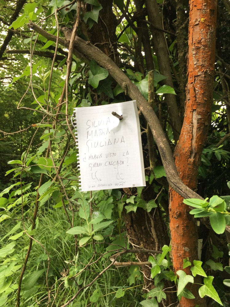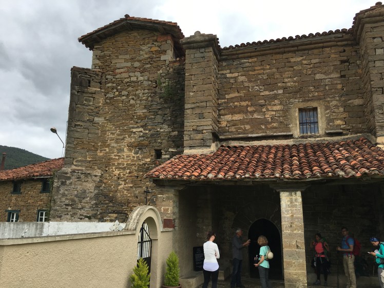 We walked for about half an hour through a quarry, passed a stunning waterfall, and then into some beautiful woods and through a small hamlet with geranium covered houses and cats. As we wandered through the woods we came across a note left for some pilgrims we’d met on Monday, reminding them to go see the waterfall.  We met up with Kimberley and Christie again. We walked a little more and came across a church, with a sign outside that said Bienvenido to the Abbey, come inside.  We did.  And guess what, it had been bought by two South Africans, Neil le Roux and his wife, and they were restoring it.  As we walked I and I heard his voice I knew he was South African. The middle of nowhere, a South African buys an Abbey to restore. Really?