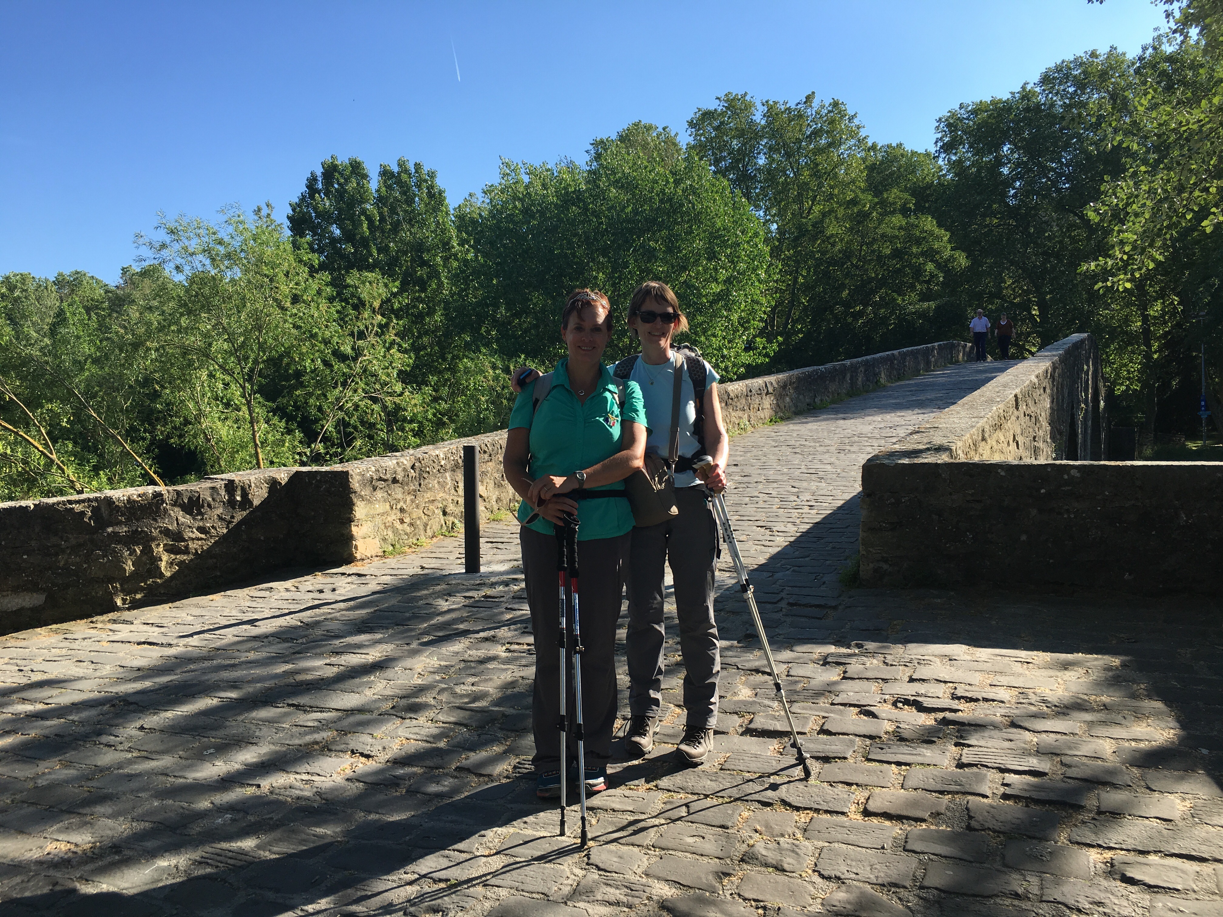 At some point in the early morning we passed two young women walking the Camino backwards with their dog. The dog also had a backpack.  We had a picnic in a sunny spot for lunch and again Kimberley and Christie passed by.  We were really just soaking in the beautiful scenery and enjoying every step of the walk. By lunchtime we had done 7kms so theoretically we only had 14 to go. Little did we know what we were in for.  The 21km mentioned by Brierley was in fact to the far outskirts of Pamplona.  We walked and walked and walked.  Fortunately, Jacqui had read about a riverside alternative Camino route we could take (as opposed to walking through an industrial and built up area).  The walk along the river was lined with trees and benches and bridges. An inspired piece of town planning, and a scenic route which thank heavens made that walk seem a lot less painful.  It was 19h30 by the time we found our hotel in the Centre of the old town.  26kms, a lot more than 21.  That crown really worked its magic today. It kept me smiling and focused. Thank you Kyle, and thank you to you and Dad for encouraging me to wear it. I love it.
