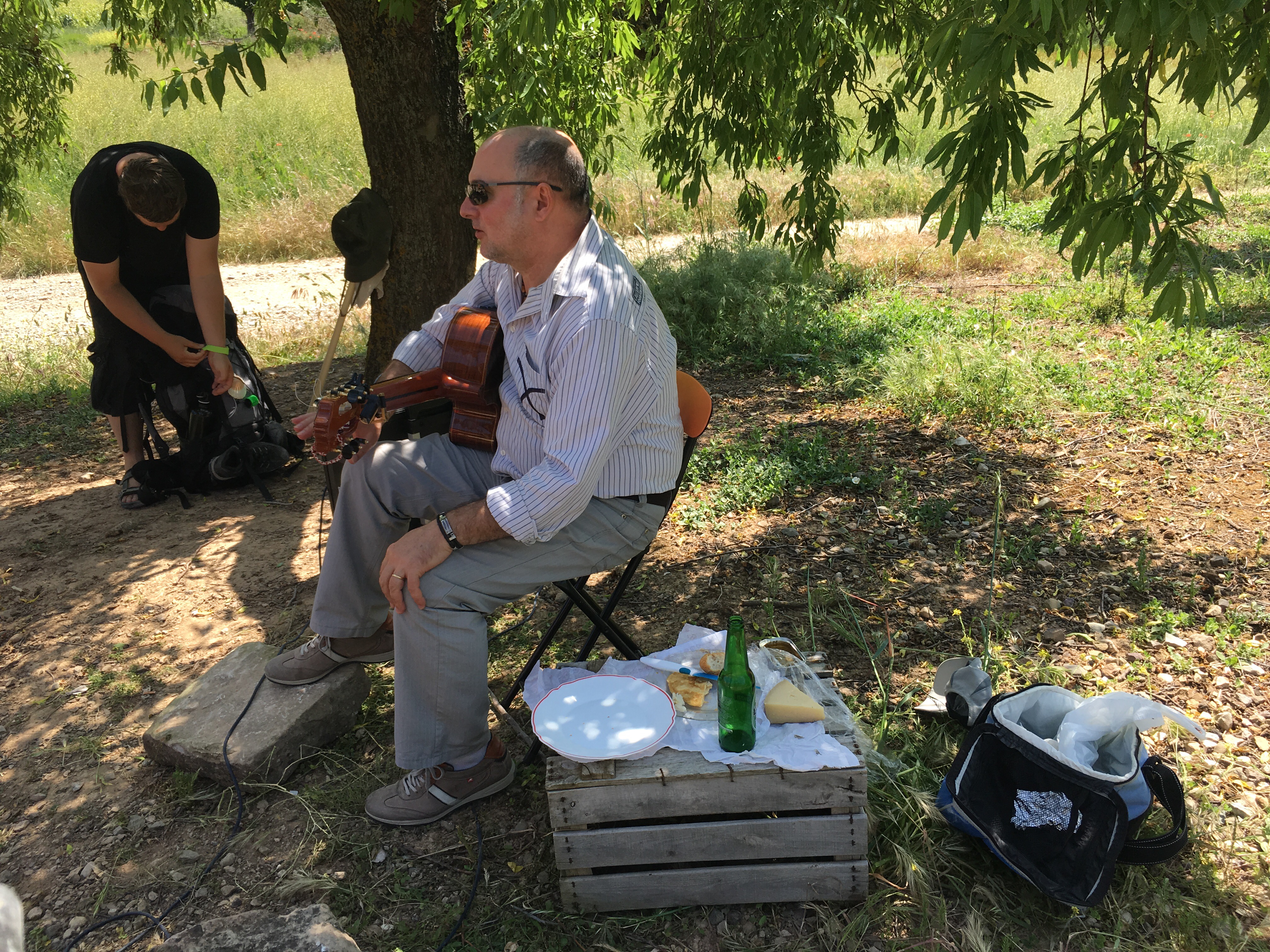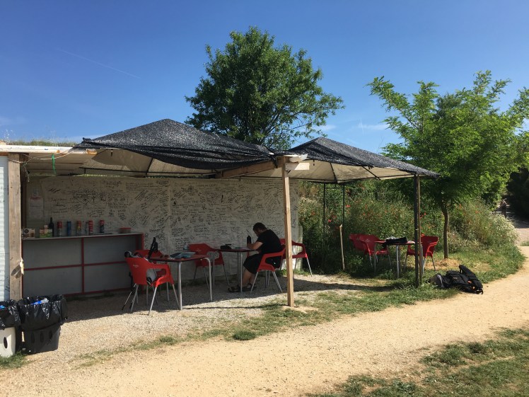 I stopped to look backwards often (something Pilgrims forget to do this in pursuit of the next destination), endless views and beauty wherever I looked. I stopped often to drink water and to take my shoes off to rest and air my feet.  At some point I came across another musician (playing guitar).  He was chatting to all the Italians.  It was lovely to stop and rest my feet. I’m wondering about these musicians, I never budgeted to pay for the pleasure every day (but then I normally have to pay to go to the toilet and now I don’t,so fair trade off I would say).  After climbing a somewhat steep hill, at the top I came upon Pepe.  He had a mobile cafe perched right there and sold cool drinks and food.  I sat for a while had a Aqua mineral con gas and he stamped my Credential (my Pilgrim passport, which is looking so good with stamps) and wrote me a little “love letter”.  He had such good energy, I gave him one of my little South African Flag magnets I am hauling along.  He asked to kiss me and somehow I got kissed on both cheeks. A lovely haven again in the middle of nowhere.