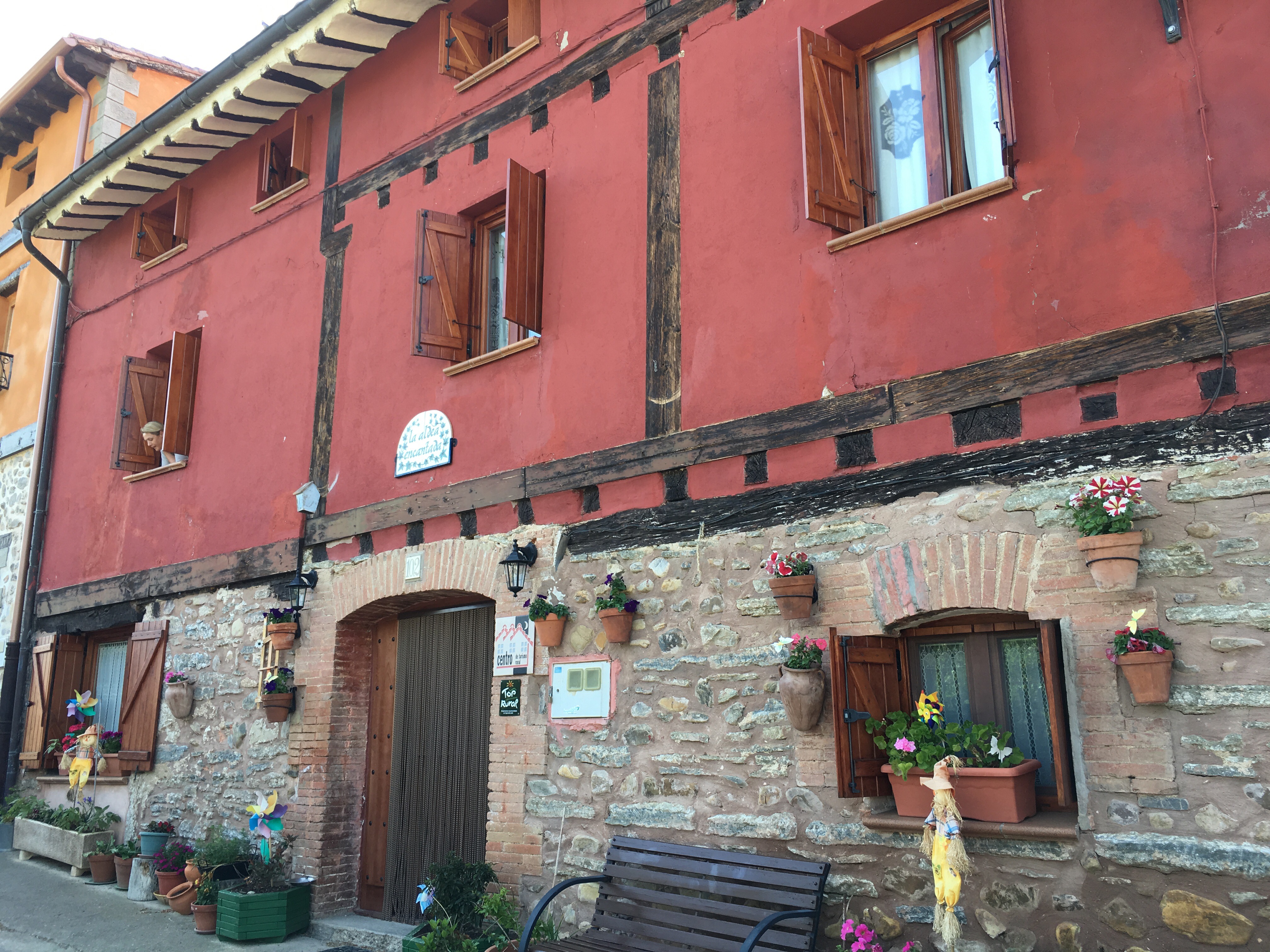 We walked into Quintanilla del Monte ( A hamlet, 1,5 Km’s off the Camino route) to Casa Aldea Encantada and it was enchanting. Ana who owns the place with Mama, helped us with goodish English. Showed us to our room, and explained when dinner was etc. Our room was lovely. We had a view of the little street. We had a picnic lunch on our beds which consisted of Societe cheese, beautiful ham, saucisson, cucumber and tomato and of course wine, which had arrived in Babar.We had a little afternoon nap before dinner.  What a luxury.