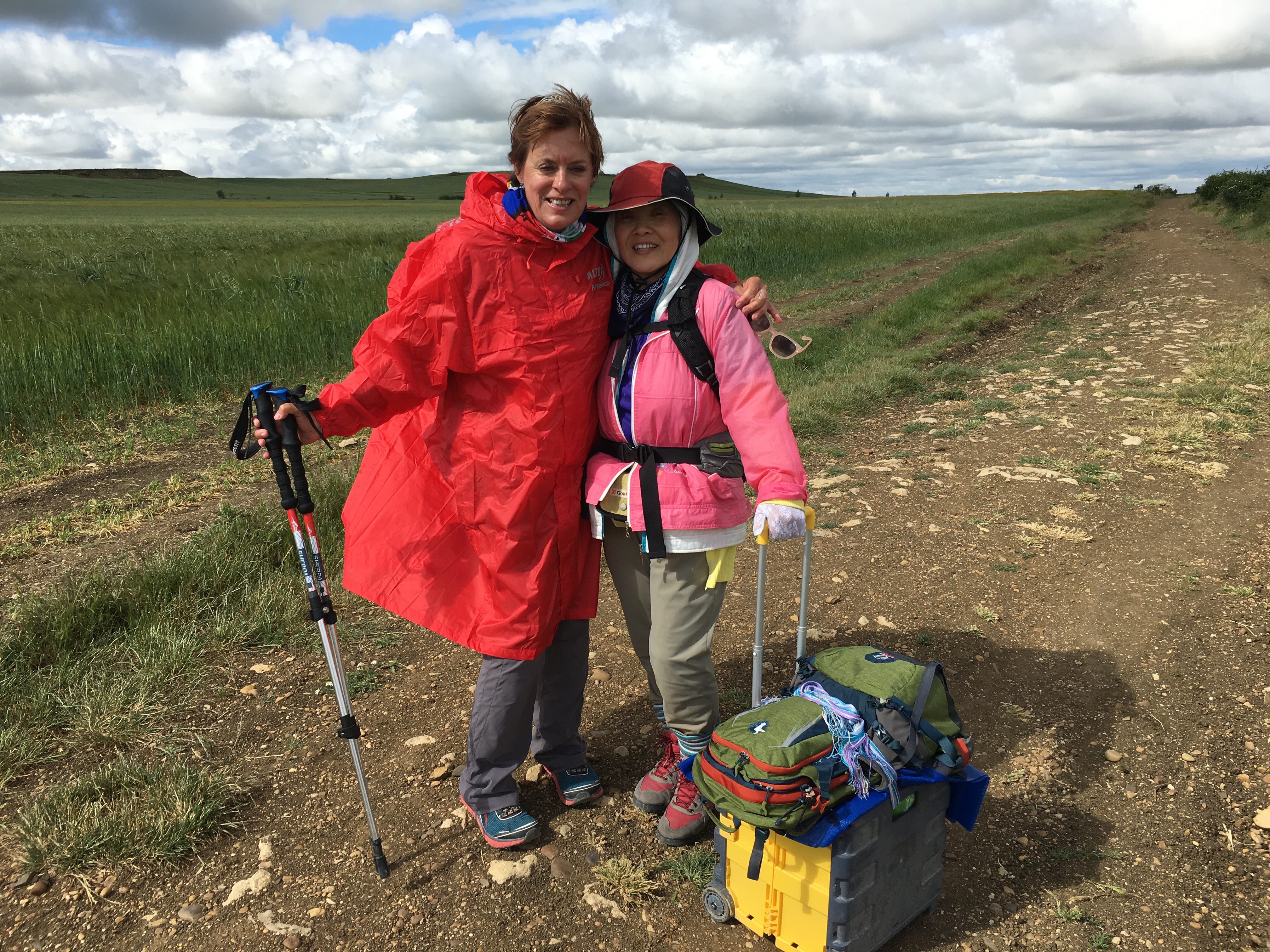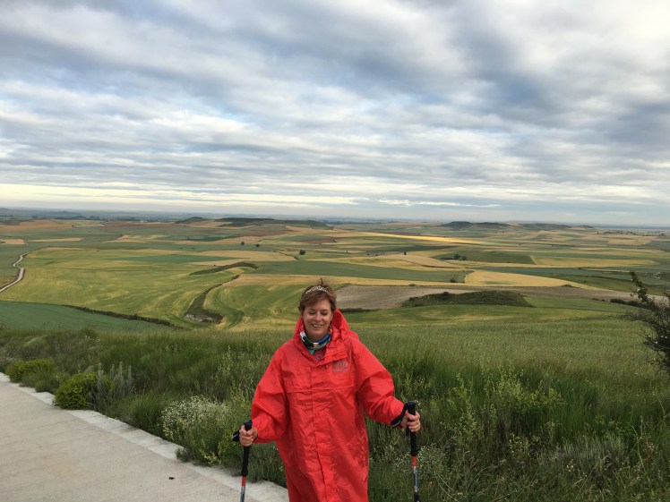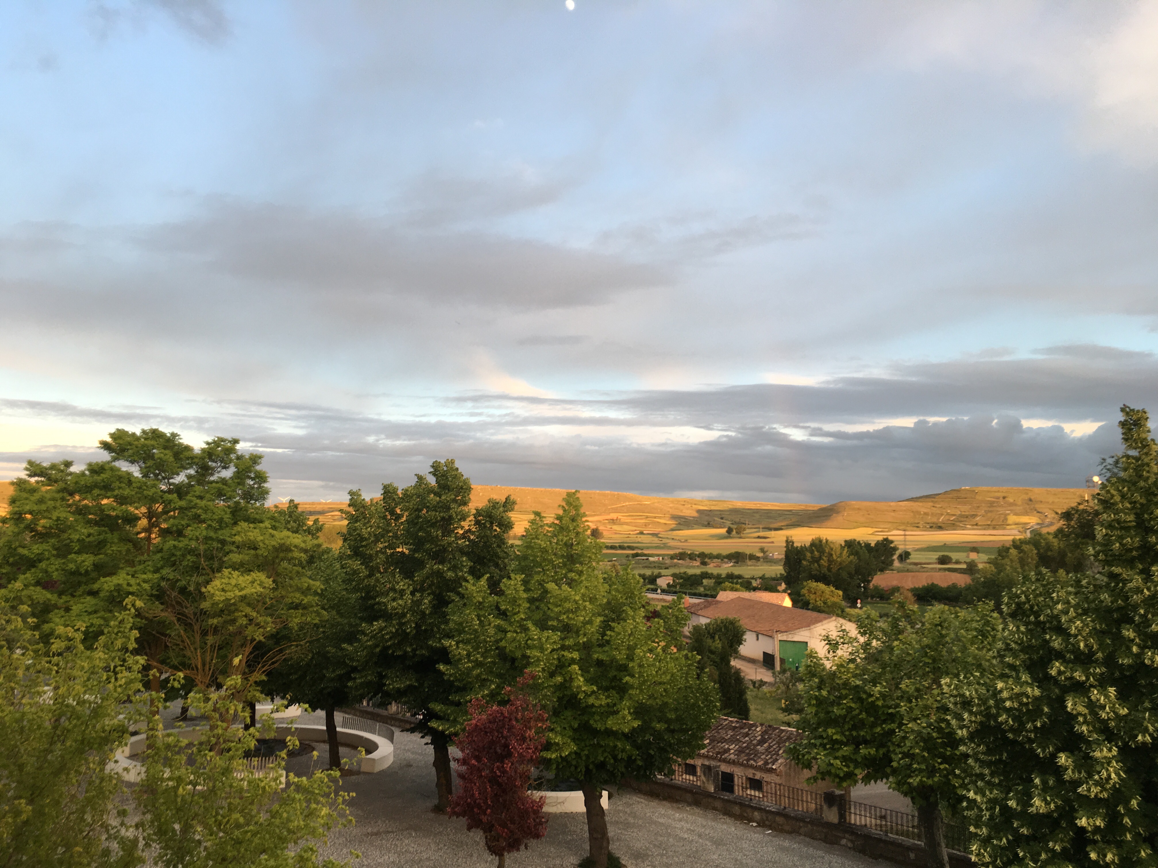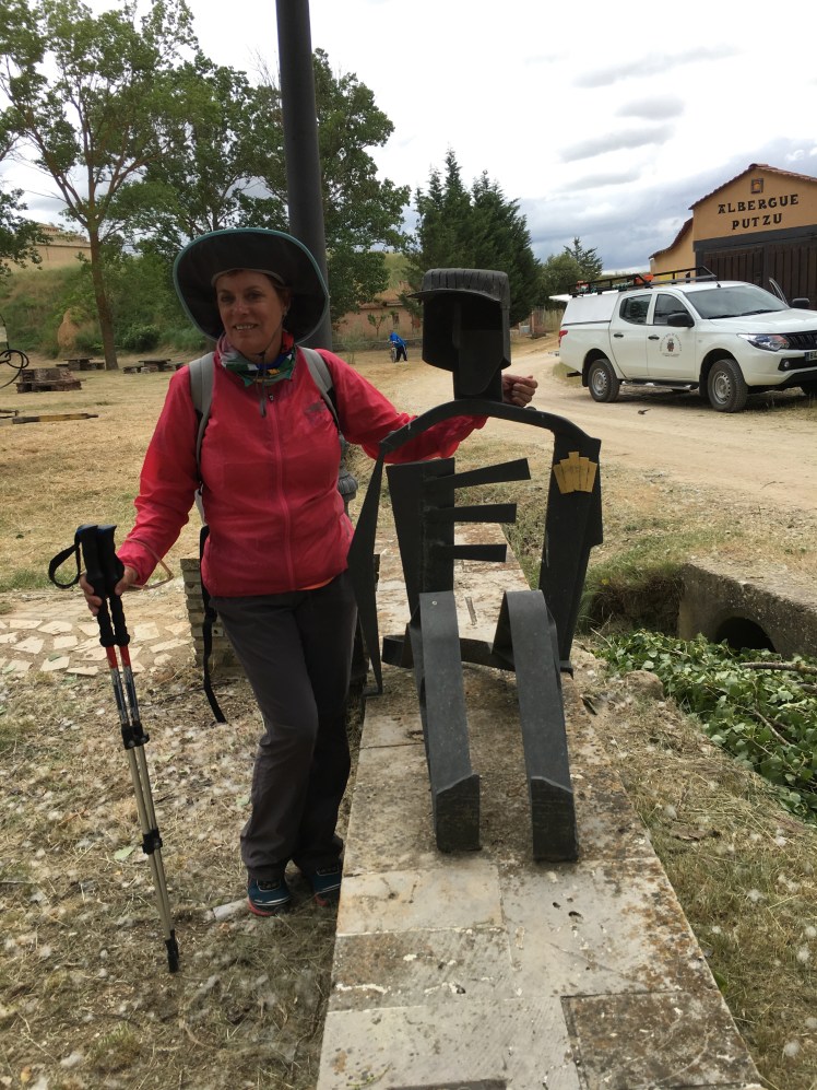 We started collecting countries early and before 9h30 we had “collected”, South Korea (a lovely couple with no English, where he keeps saying happy, happy and she drags a very heavy looking trolley behind her. He asks to take our photo, and then says ‘Ok, one, two, three, ha! Ha! Ha!”- you can only imagine our reaction). Norway in the form of Aart, took our photo over the Meseta. Italy, cycled past us and sang “We wish you a merry Camino ……”. France popped in at some point, Germany and Puerto Rico too. I have to tell the story about the six Franch people have been walking “with” me since Estella.  There are three couples, they are checked into every hotel I am and we see them every so often at dinner.  WE great one another like one lost friends, but their English is as bad as my French. Lovely group of friendly people who get incredibly sunburnt every day.  We see them walking, we pass them, they pass us, they stop, etc…., then we see they ahve two cars. And because of the language thing we cannot establish how they walk and drive.  Eventually the one woman that can speak five English words solves the mystery. The ladies start walking in the morning while the men drive to the next village in both cars, drive back in one car and then start walking and catch up with the women.  Then repeat in evening to retrieve car. Interesting system.  Such lovely people.