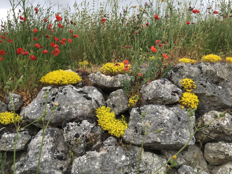 The Meseta was cold today but extremely beautiful. Every shade of green, yellow, red, purple, brown and blue colored every spot we looked at. Flowers everywhere.  At some point after asking for about 10,5 Km’s only seeing fields, flowers, sky and hills, we cam over a rise and came upon Hontanas another classic Pilgrim village.  Very quaint, population 70. Sarah and I were having our ritual daily 10km point cafe con leche, when up walks Jennie (from Eureka).  Jennie had only left Hornillos at 9h15 as she had to wait to be lifted too.  Jennie is like the Road Runner, she moves it.  We had just sat down, so she must really have been moving it.  Jennie then delightfully joined us for the rest of the walk.
