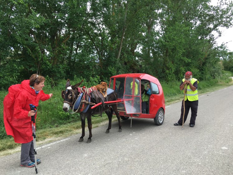 At some point in our day we met up with a man and woman who had done the Camino backwards no forwards four times.  HE had a half sawn off car being pulled  by a donkey, with a dog on top of the donkey.  His partner sat in the air, he walked and talked to the donkey and the dog. You meet such interesting people on this path.