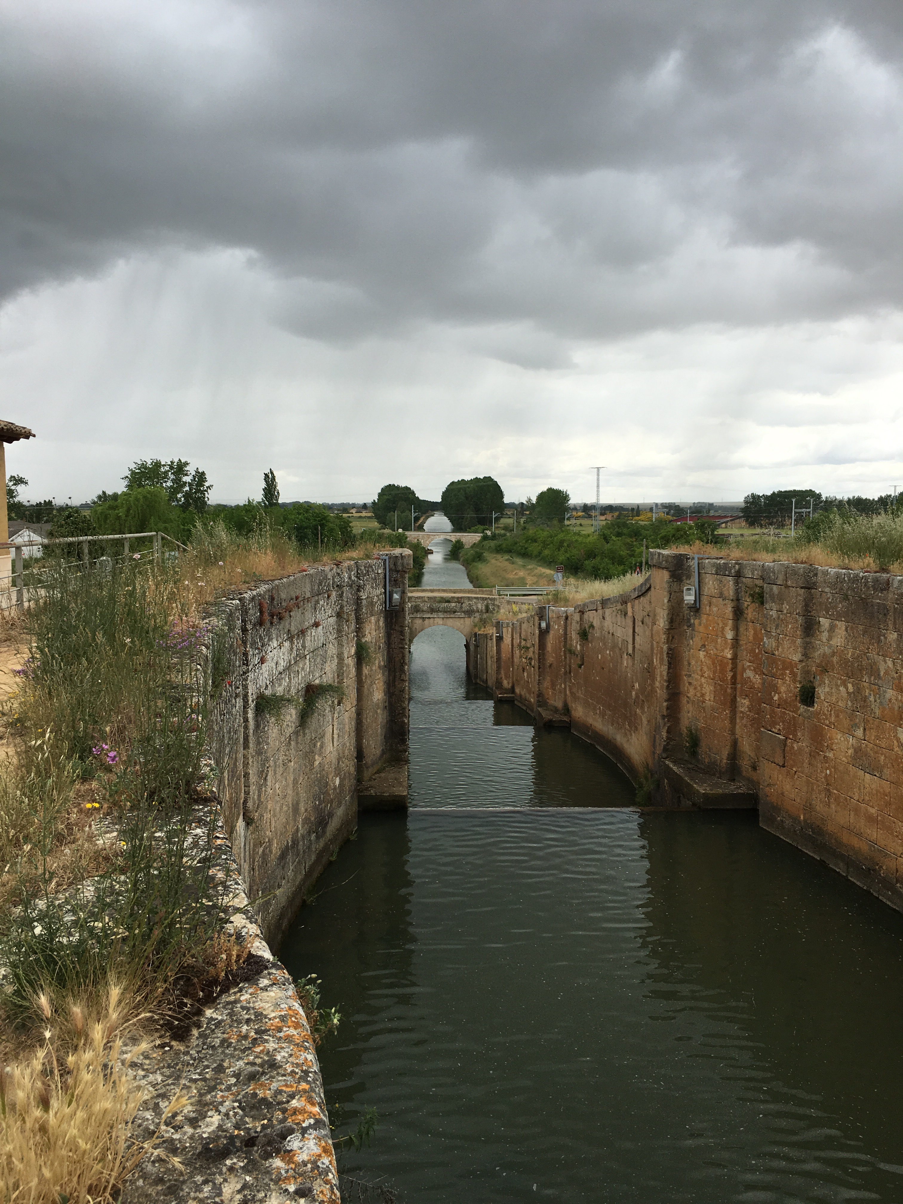 At some point in the day we met two men pushing a pram, filled with puppies.  They spoke enough English to tell us we could take a photo for a donation. We did. It rained a bit on and off, but walking along Canal de Castilla was beautiful.  Such color. I want to stop and paint everything (lessons here we come again).