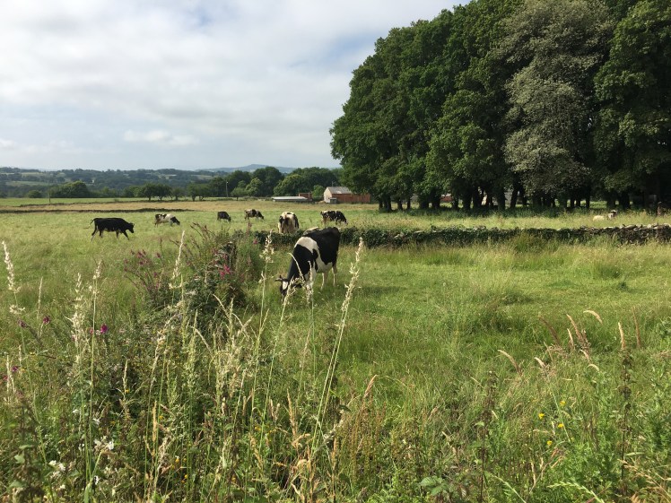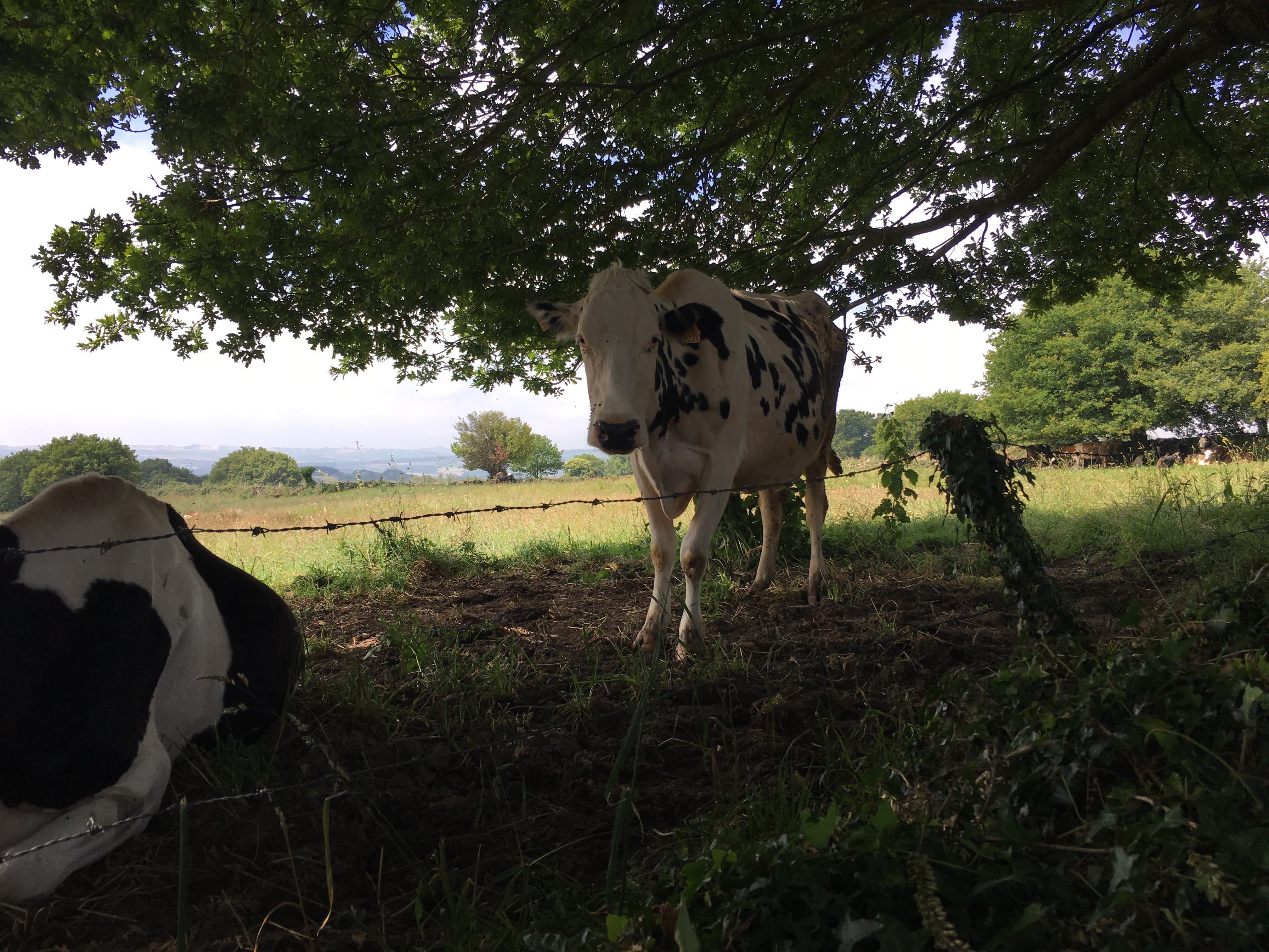 (We have been walking through Dairy farm country and the cows are everywhere.  You come around a corner and suddenly you’re surprised by a munching and or mooing cow)