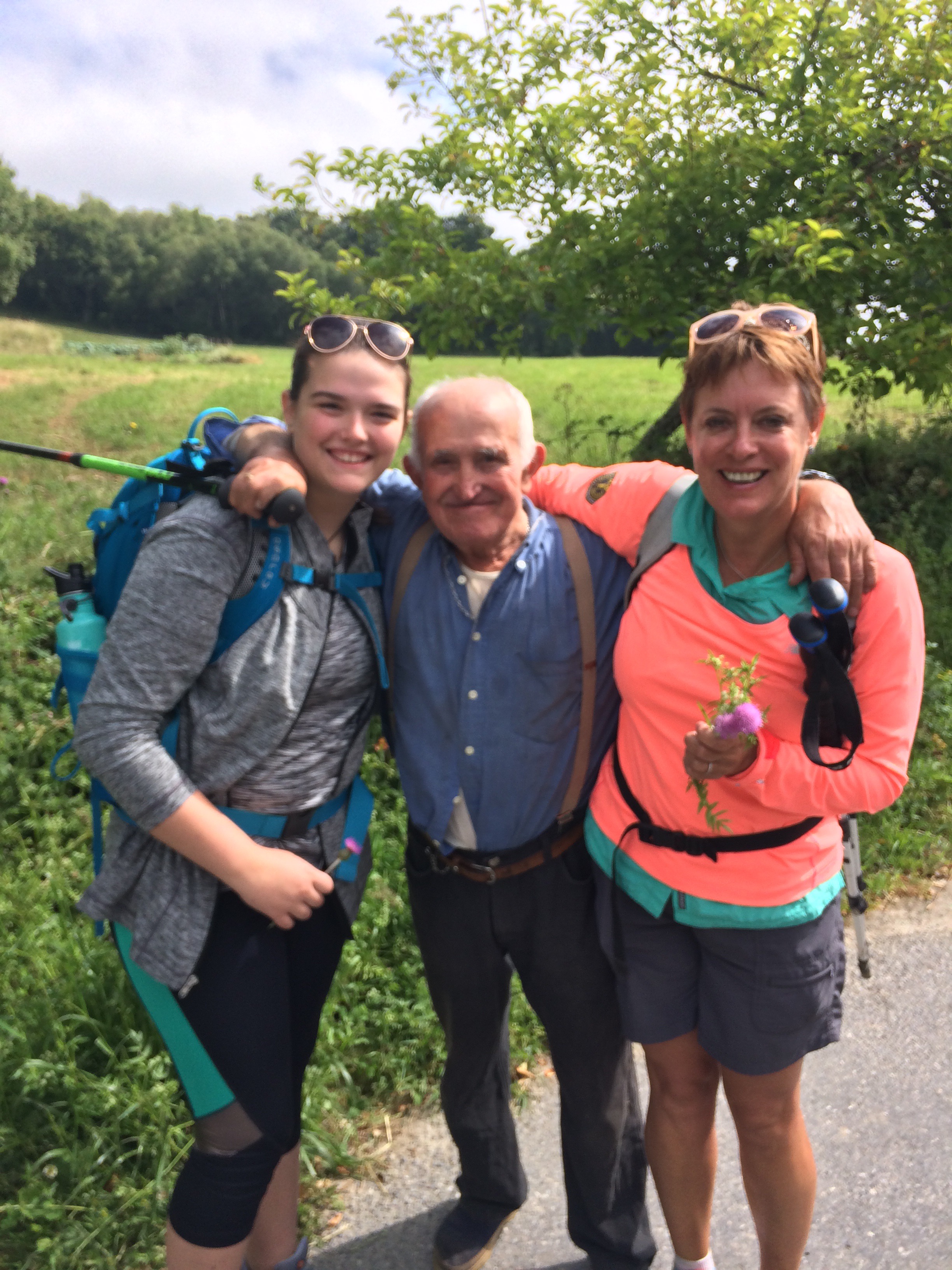 Rachel had a lovely first day walk into Portomarin, pity about her feet getting blisters.  We encountered cows around every corner, we watched as two naughty little goats escaped from their mom and perched on a little wall to eat tasty brambles. We saw streams and rivers, we saw beautiful birds and butterflies and walked through kilometers of woodlands and shade.  The weather was beautifully overcast and we stopped several times to rest and let her take off her shoes. At one point we were walking past a closed barn, an old man walked out with a “Pilgrim pole” in his hand, we greeted him, he showed us to stop bent down picked a thistle and gave it to Rachel with a big smile and some Spanish.  We smiled and thanked him profusely in Spanish. He then proceeded to assemble a bouquet of wild flowers and then played “eeenie, meenie, minie,mo”, pointing to Jen then me etc.  Jen pointed at me and he gave me the flowers.  We asked if we could take a photo he agreed and was beaming from ear to ear. When we were done, he walked back inside the barn, it seemed his mission was to make us smile. We were all charmed, but especially Rachel), it came just when she needed something distracting. What a delightful Camino moment!