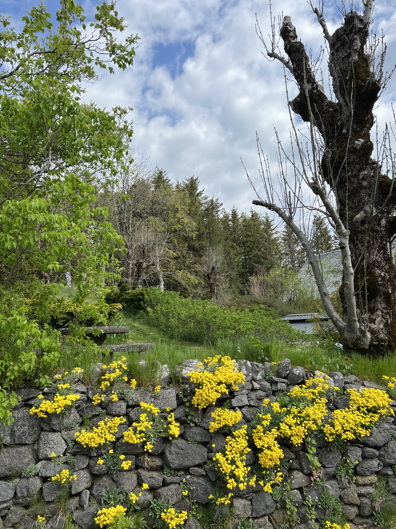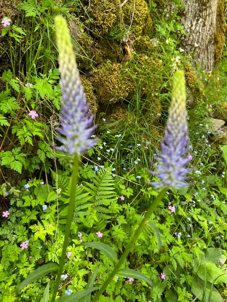 At some point we turned into a forest lane that was very rocky and a steady down hill surrounded on both sides by either pastures or trees and of course the ever present walls. This 5kms is probably my best so far. Scary to say as everything is so damn gorgeous but this stretch of lane that went in and on and on was exploding with flowers. In the forest, on the pathway, in the rocks, along the sides. Pure bliss for a tower child like me. I think my camera was groaning at the weight of all those photos. Pinks, blues, yellows, lilacs, cerise, white, orange, purple …….. DELIGHTFUL!