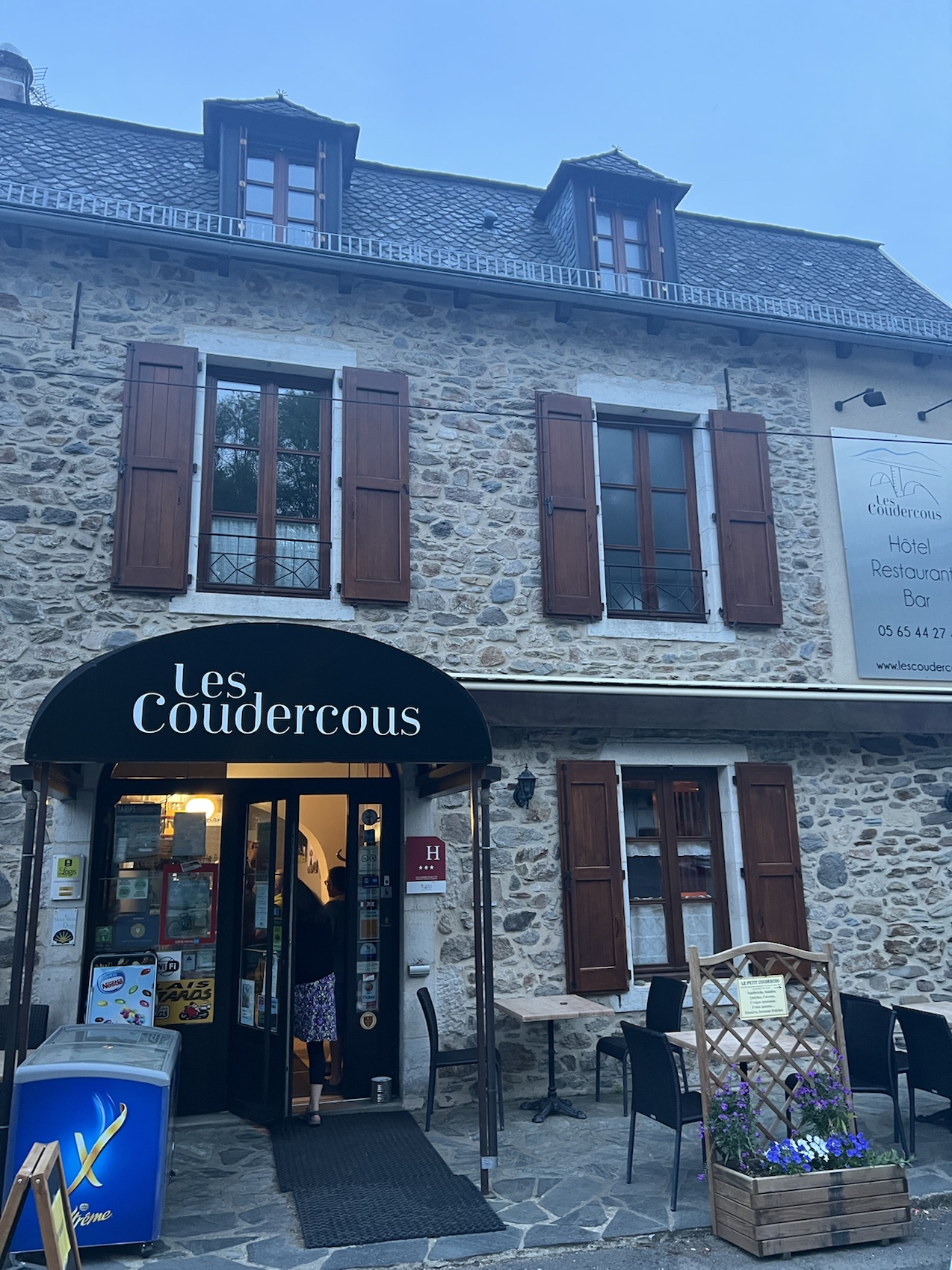The pathway down was steep and quite rocky and just exploding with flowers. The hotel was just lovely and the regional meal of Cold Courgette soup, A type of regional cottage pie with cheese and the white cheese mousse was to delicious. All accompanied by delicious red wine. We had to go for a walk after dinner to digest the food a bit.