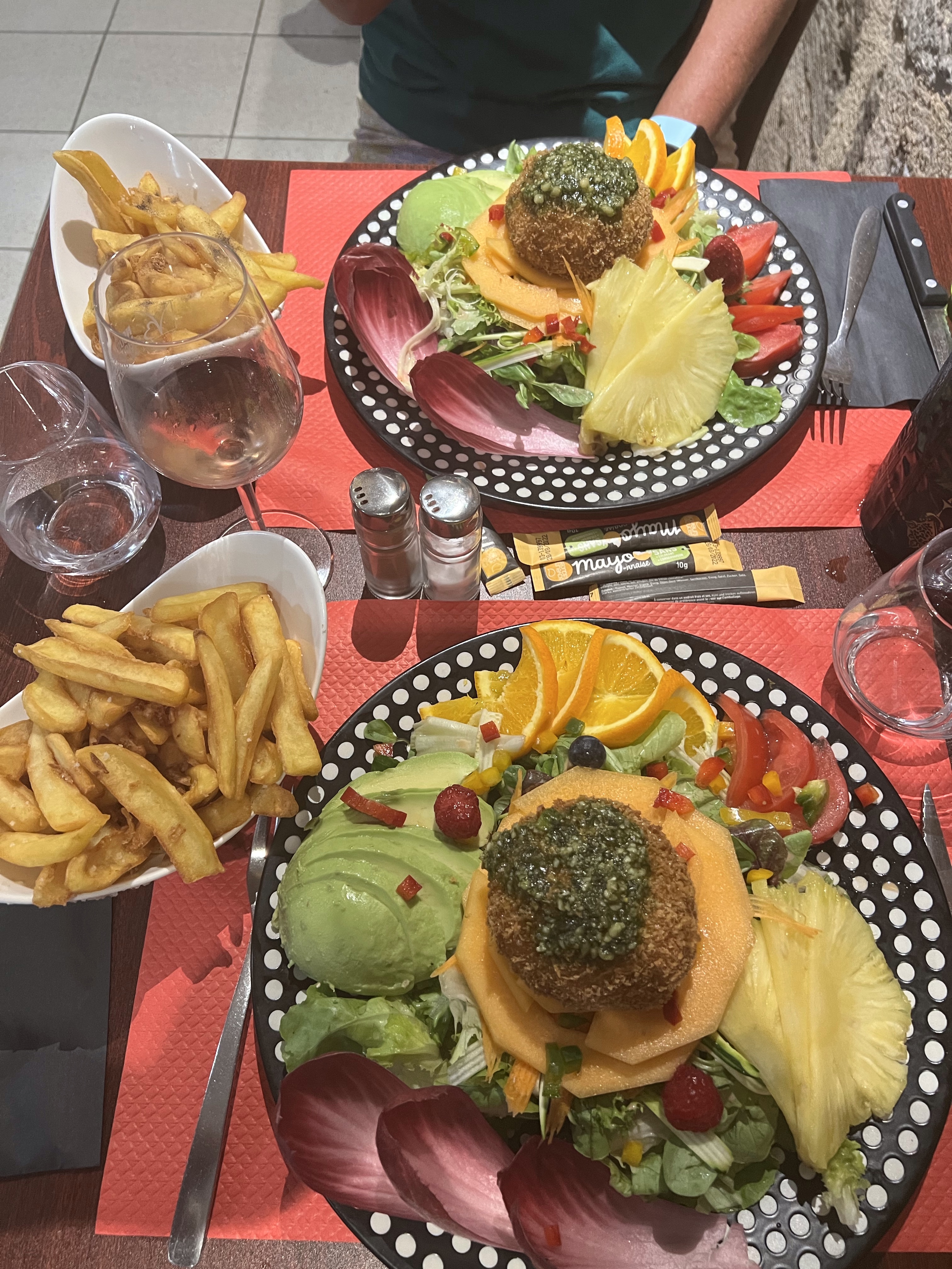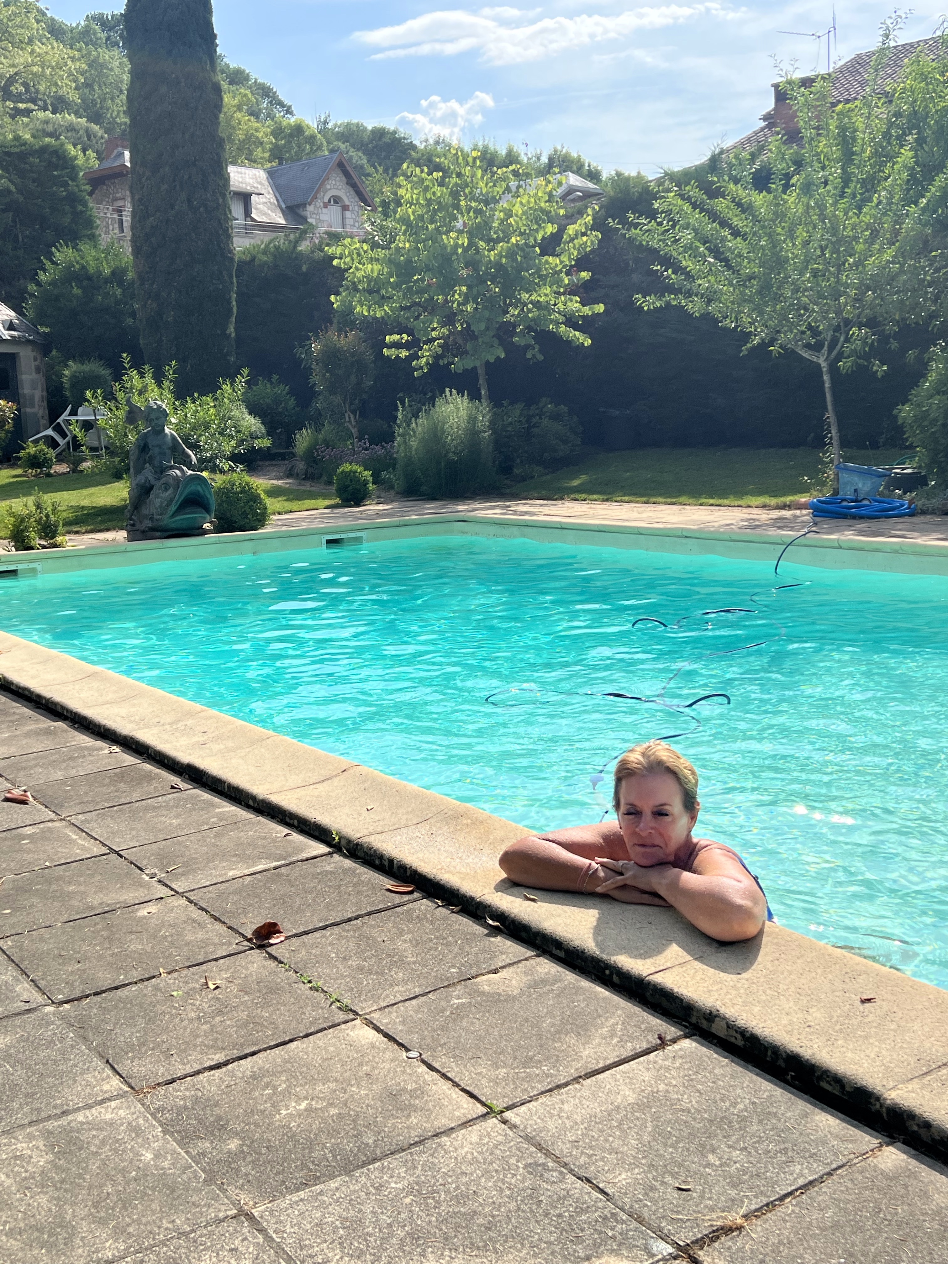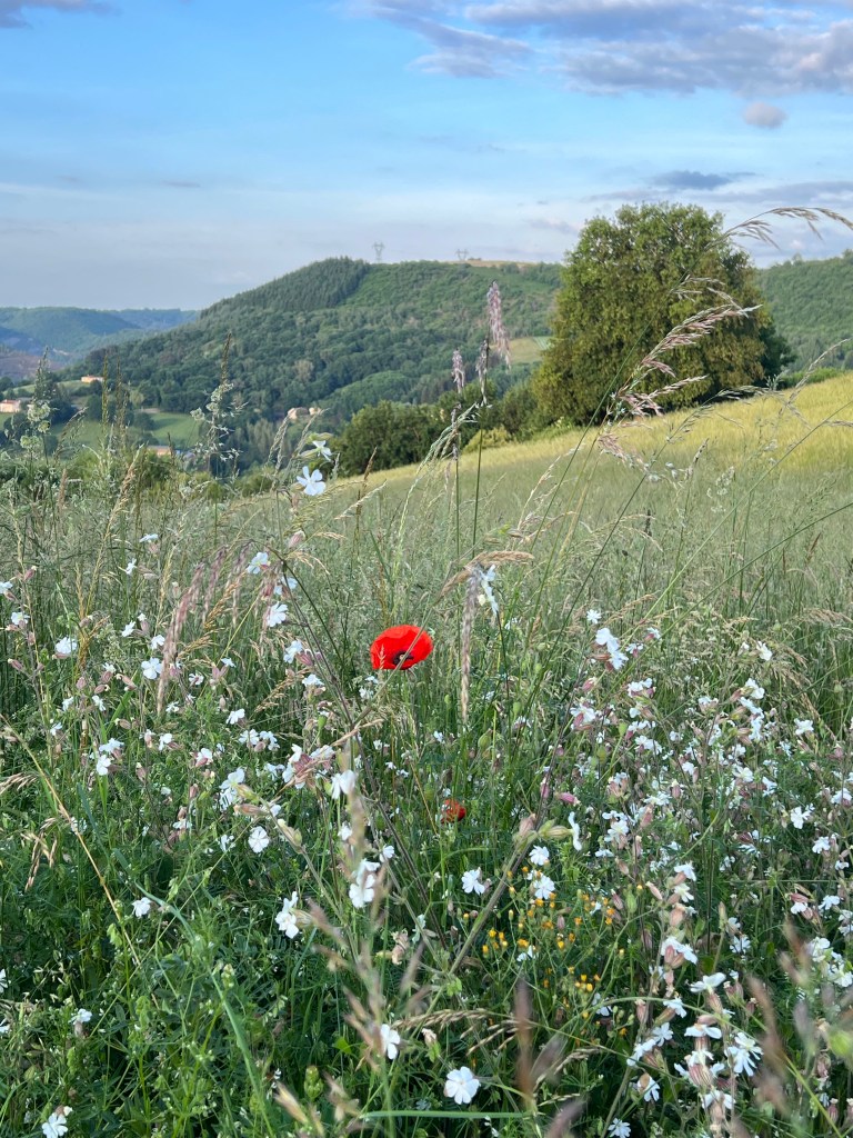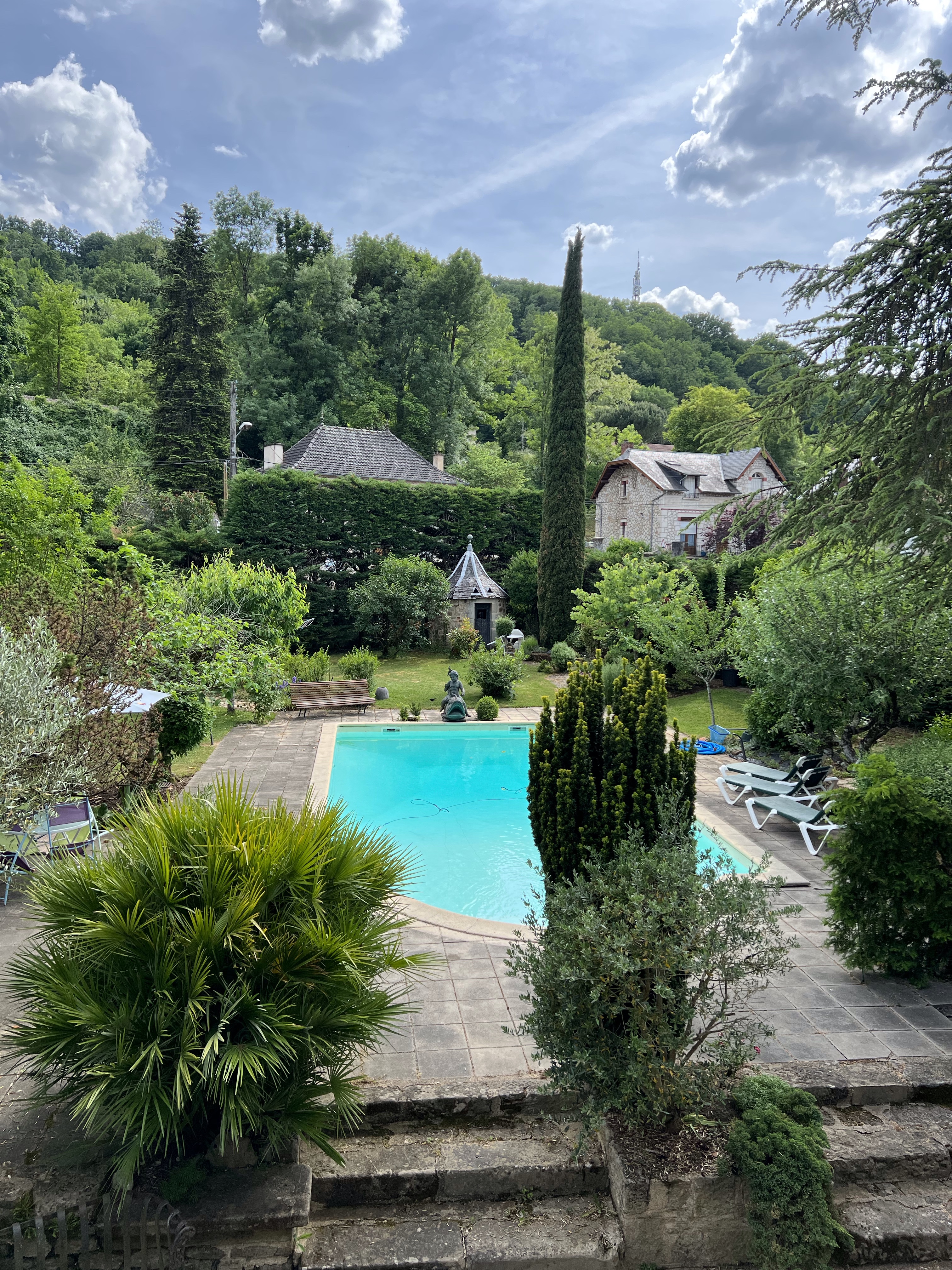 We walk the rest of the way together and it is far and tough, the ground under our feet is gravelly and rough and inhospitable, but the scenery is beautiful. We see no one, no Pilgrims anywhere. We are convinced we took a wrong turn. We wander into Figeac and need to find our Chambre d’hotes. We find it after about 20 mins and the door is answered by a charming gentleman named Gerard. He shows us the enticing swimming pool and brings us a bag of ice for our G&T’s, of course, not our feet. We have dinner in town. A delicious bottle of Rosé and a salad a horse could not jump over, with frites of course. A beautiful Chambres d’hotes called Les Pratges Hotel.
