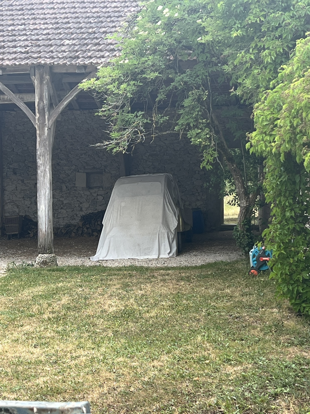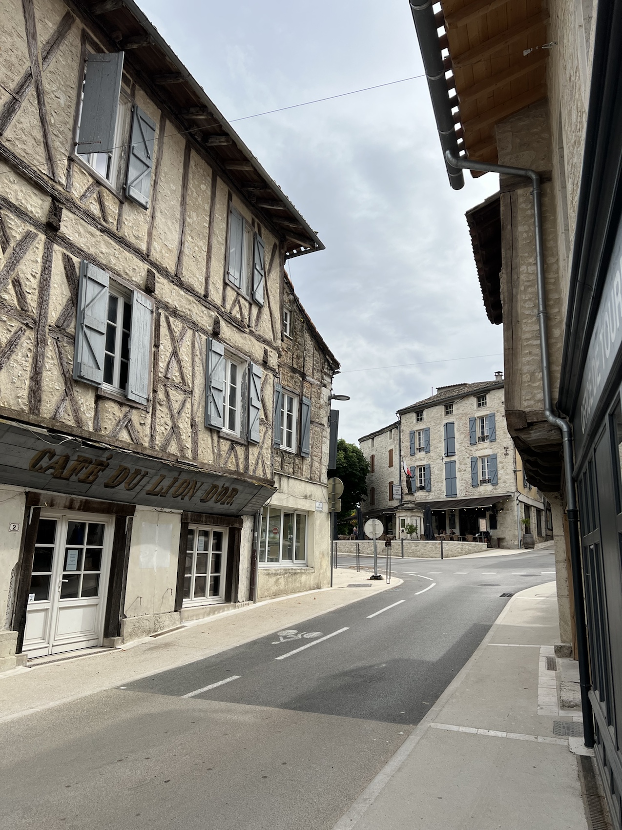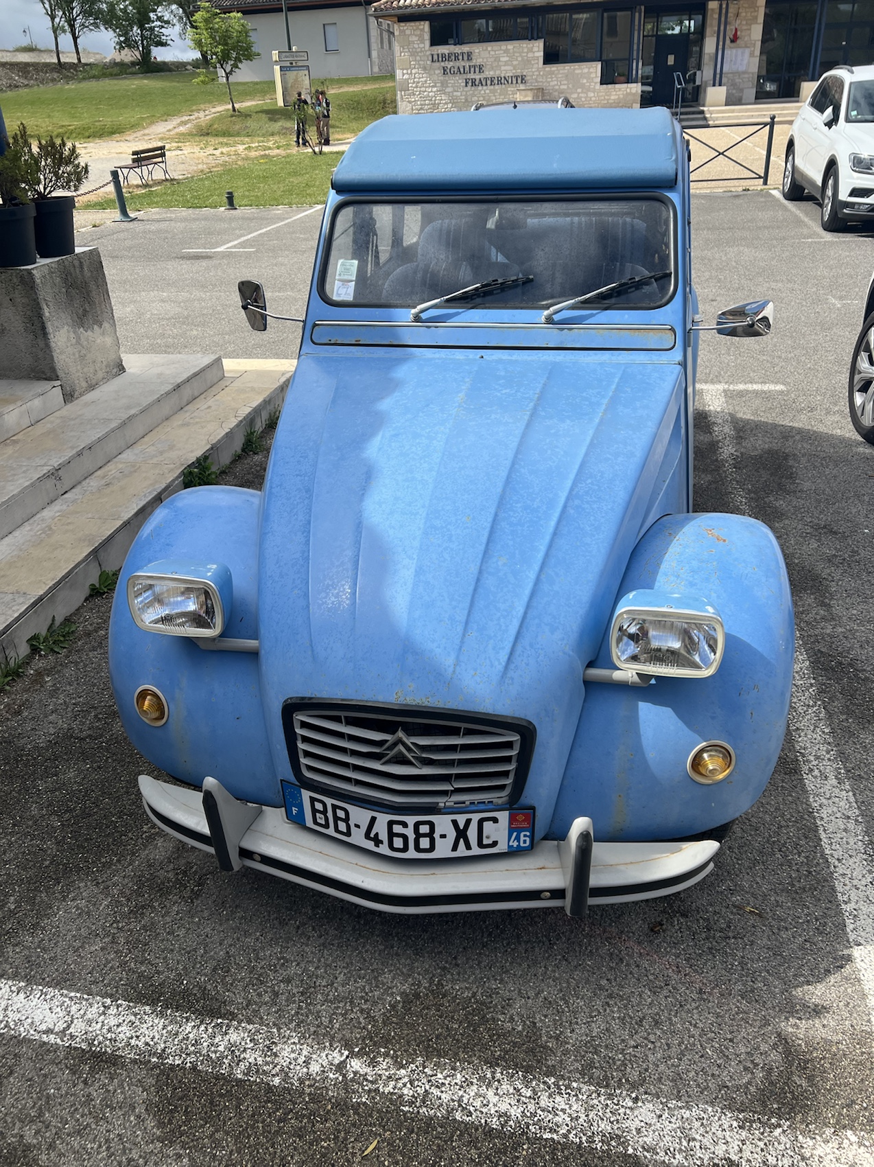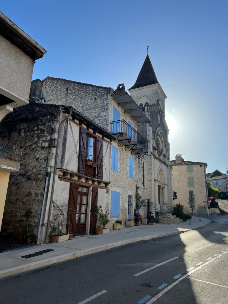 I stopped for a coffee in La Bastide-Marnhac where I recall Warwick and I stopped too when we dipped into this Chemin in 2019. The coffee was super delicious and the little biscuit that came with it even better. I was determined to look after my feet today so my socks and shoes were off for the required 16 mins and I enjoyed the coffee. There was a beautiful old 2cv parked in the lot when I sat down. The fifth one I’ve seen since Paris. Warwick and I play a game of spot the 2cv when we’re in France, it’s fun!