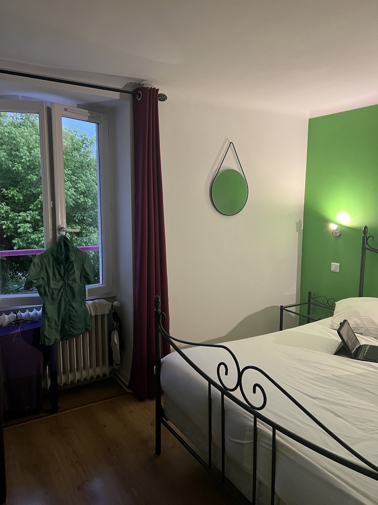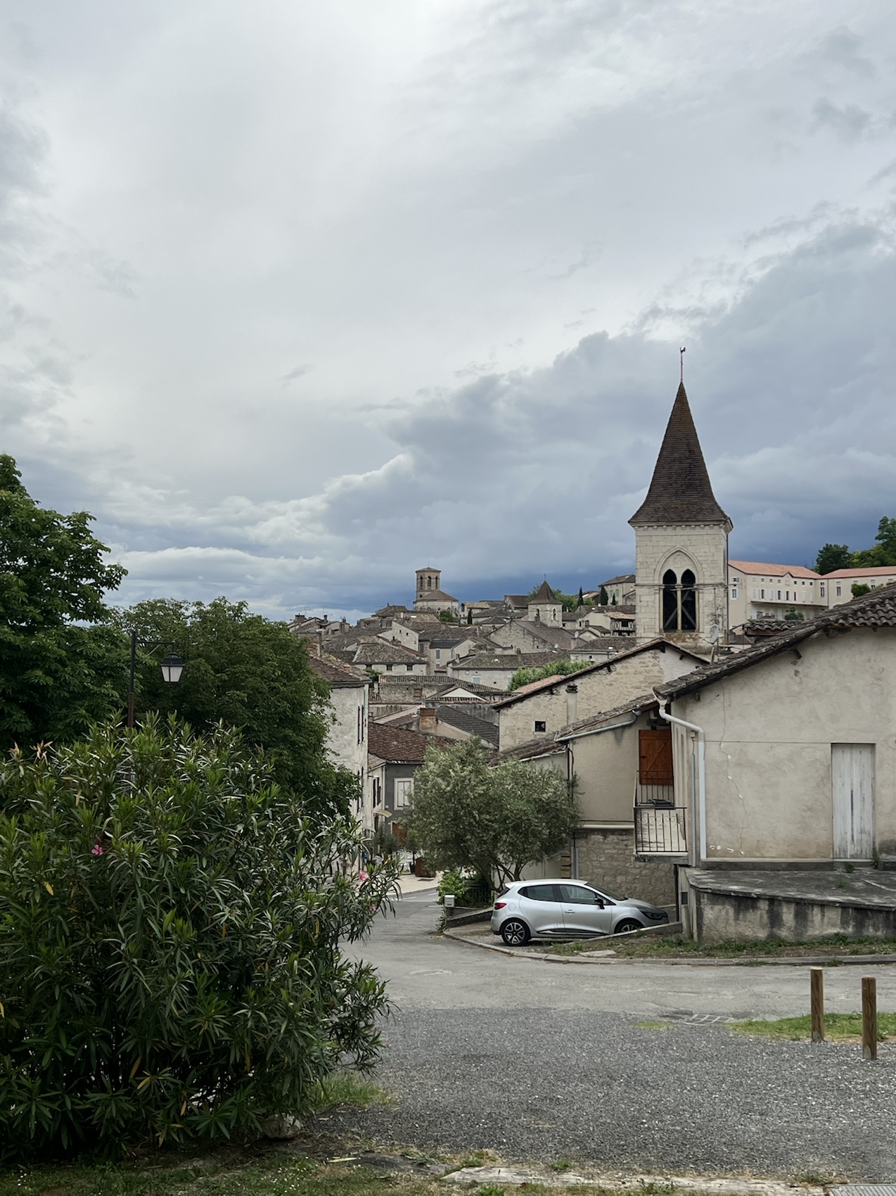 We reached Montcuq around 17h35. A long day but thankfully cool and relatively easy walking. We asked about our Hotel La Barquelonne at the Tourist office and set off in the direction of it when it started raining. We started running (imagine running when you’ve just done 35kms), we couldn’t see it and as we were sheltering in the doorway of a hotel a man pops his head out of another door (looks just like Chris de Burgh) and shouts out “You’re here, I’ve been waiting for you!” I protest and say we’re in the wrong place he brings us in and there Jennie sees Pricilla and exclaims “We’re here!”